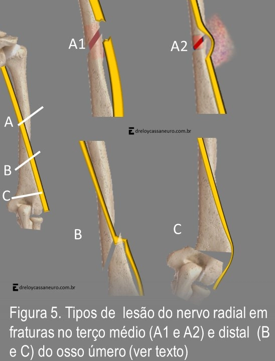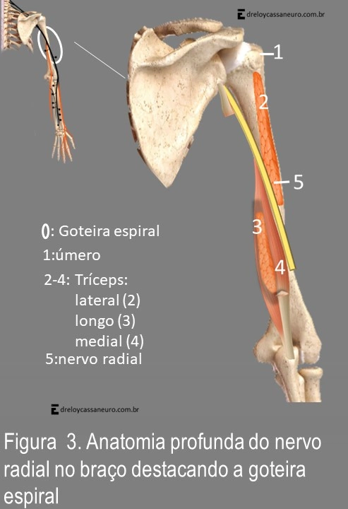 O nervo radial pode ser lesado em qualquer ponto de seu trajeto, sendo mais vulnerável a trauma e compressão na goteira espiral (fig. 4), devido à sua passagem por um canal com assoalho ósseo (úmero) e teto formado pelo músculo tríceps.