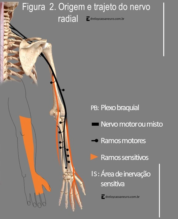 O que é a NRT. O nervo radial (fig. 2) origina-se na medula espinhal nas raízes de C5 a C8 (T1), passa por todos os troncos do plexo braquial, desce pelo braço curvando-se em torno da goteira espiral do úmero e, no cotovelo, divide-se em um ramo superficial e no nervo interósseo posterior.