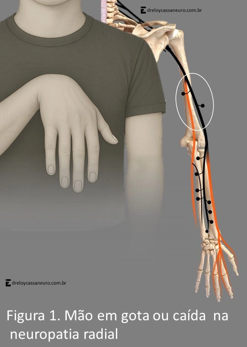 Diagnóstico. A NRT, NRC e PSN apresentam manifestações clínicas semelhantes, incluindo déficit motor na mão e punho, levando à postura de queda do punho e dedos — aparência conhecida como mão em gota ou mão caída (fig. 1). Isso resulta da fraqueza dos músculos extensores do punho e dedos, inervados pelo nervo radial. Também pode haver déficit de sensibilidade (adormecimento) na área inervada pelo nervo radial, principalmente no dorso da mão.