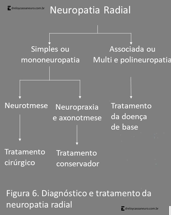 No diagnóstico diferencial da NRT e NRC, lembramos que o nervo radial pode ser lesado em locais variados de seu trajeto. Quando a lesão é isolada como na NRC e NRT ocorre uma mononeuropatia; quando a lesão do nervo radial é comum com outros nervos, diz-se que a neuropatia radial é associada, conforme ocorre em diabetes, hanseníase, vasculite, doença do neurônio motor, neuropatia multifocal etc., muitos desses casos são estudados como multi e polineuropatias.