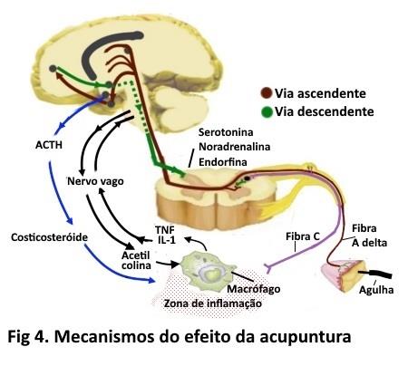A que se deve o efeito ou como funciona a acupuntura na dor. Uma analogia fácil para entender o efeito da acupuntura funciona na dor é comparar cada sessão a um coquetel (ou poção): uma sessão de massagem relaxante, uma dose de antinflamatório, uma dose de corticosteróide, uma dose de morfina e uma dose de antidepressivo; obviamente que o coquetel, guarda a devida proporção de cada ingrediente (figura 4). Em termos médicos, o efeito analgesico da acupuntura deve-se a 5 mecanismos (figura 4). Primeiro: é o efeito local com relaxamento muscular (ponto gatilho e contraturas) e aumento da perfusão sanguinea. Segundo: é chamado de segmentar, sendo relacionado a inibição dos impulsos dolorosos (na medula espinhal) provenientes da área de dor e inflamação; a agulha estimula fibras A-delta do nervo periférico, as quais a nível medular bloqueiam a entrada da informação dolorosa das fibras tipo C (fibras da dor). Terceiro: é chamado de heterosegmentar, ocorrendo, quando a informação do agulhamento chega ao sistema nervoso central (via ascendente), desencadeando várias reações, com ativação sistema descendente (supressor da dor) culminando na liberação de serotonina, noradrenalina endorfinas ao nível de toda medula espinhal; este efeito diferencia por exemplo, a acupuntura de uma infiltração, pois nesta o efeito desejado é mais local enquanto o efeito daquela é mais sistêmico, ou seja, ocorre em todo o organismo. Terceiro: a resposta analgésica e antinflamatória ocorre após liberação do ACTH na hipófise e do cortisol (supra renal), o qual atuará nos tecidos inflamados suprimindo a liberação de citocinas inflamatórias (TNF e IL-1β) pelos macrófagos. Por último temos o efeito antinflamatório mas de cunho imunológico (na verdade neuroimune) desencadeado pela ativação do nervo vago, o qual pela liberação de acetilcolina inibe a síntese de citocinas inflamatórias (TNF e IL-1β) nos tecidos. .