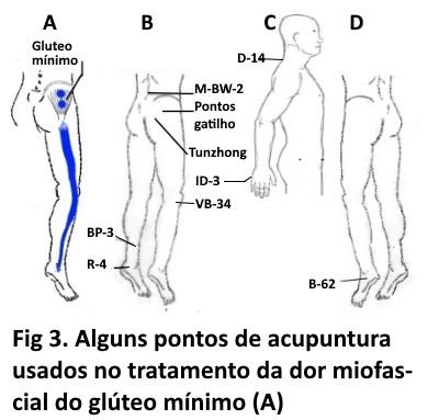 Acupuntura chinesa e ocidental para dor. Na dor as técnicas mais utilizadas são a acupuntura tradicional chinesa, aliada à técnicas da acupuntura ocidental; embora com muitos mecanismos conhecidos na acupuntura chinesa o modelo ocidental teve um desenvolvimento extraordinário nas últimas décadas, notadamente a acupuntura segmentar (Bowsher D 1998), da contratura muscular (Gun CC), dos pontos gatilho (Travel e Symon). Para exemplificar, no tratamento de uma dor muscular do quadril que irradia até o tornozelo, a distribuição da dor se dá no meridiano da vesícula biliar em termos da medicina chinesa e do músculo glúteo mínimo e raízes (L5 e S1) da acupuntura ocidental. No início do tratamento buscamos um efeito analgésico geral, sendo as agulhas inseridas mais distalmente (do pé a cabeça) nos meridianos e nos segmentos (L5 e S1) da coluna. Nesta fase na dependência da intensidade do dor podemos associar medicamentos para aumentar o efeito analgésico. Na medida da melhora do quadro, iniciamos o tratamento mais específico, aproximando-nos dos pontos locais, onde fazemos tratamento da contratura muscular e dos pontos gatilho. Na medida da melhora começamos a redução dos medicamentos, e após o quadro controlado, iniciamos o fortalecimento dos músculos enfraquecidos do quadril; o enfraquecimento muscular de alguns músculos do quadril é considerado a causa mais comum desta dor. Nesta fase a manuteção do tratamento é mais descontraída: uso de medicamento apenas quando o paciente apresenta dor, espaçamento das sessões e atividade física regular adaptada a cada situação